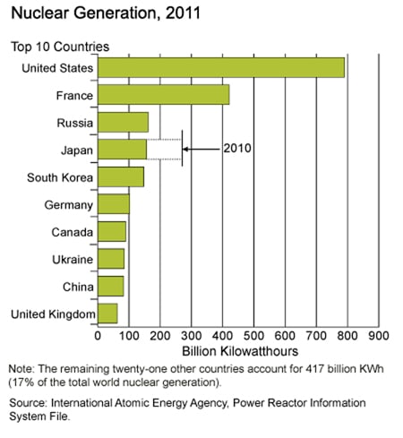 The United States generates more nuclear power than any other country in the world, clocking in at almost 800 billion kilowatt-hours in 2011.