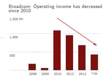 In this way, increasing competition from Qualcomm and a weaker demand for 3G connectivity semiconductors could keep hurting Broadcom's business. Notice that Broadcom's sales in this segment contracted almost 3% last quarter. That may be just the beginning.