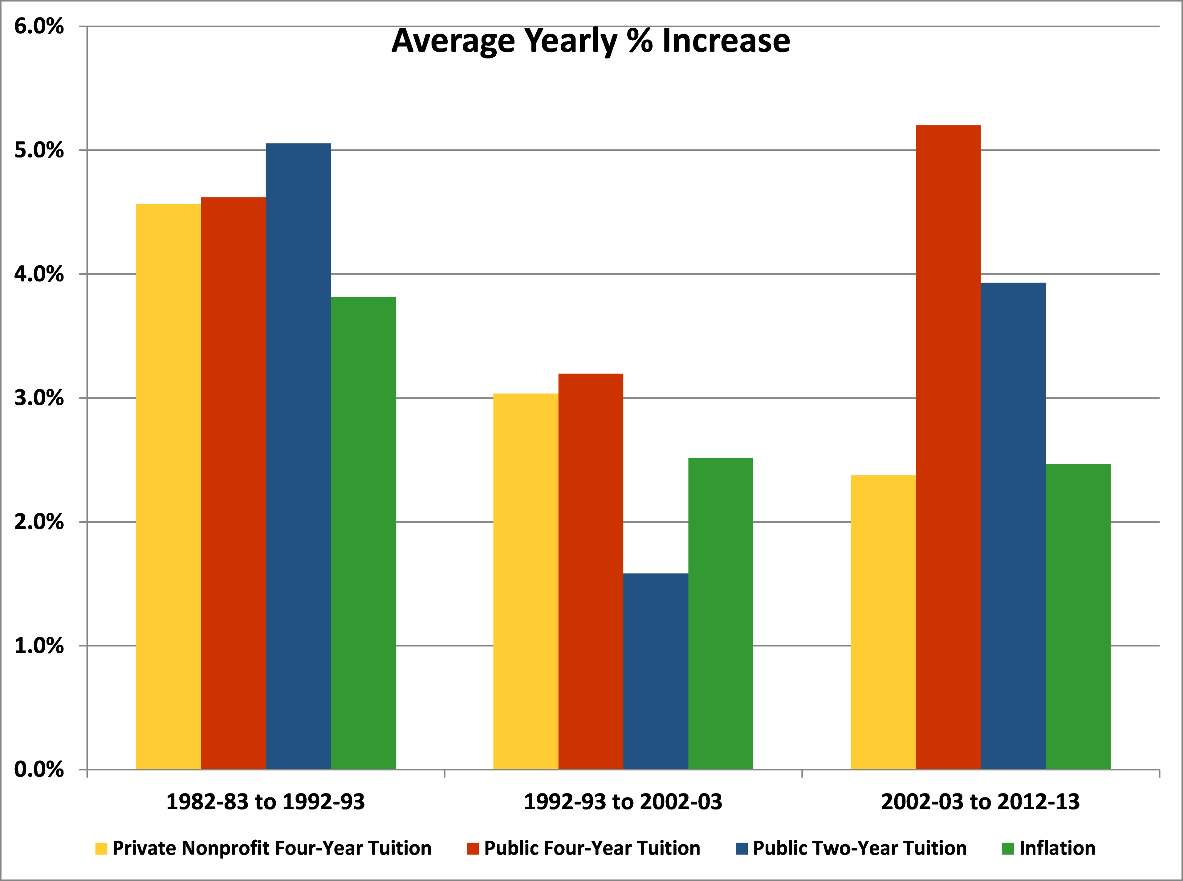 College costs at public four-year universities have risen 5.2% per year on average over the last decade, compared to just 3.2% in the prior decade, based on a report done by the College Board. Notably, those costs have risen even faster than inflation: