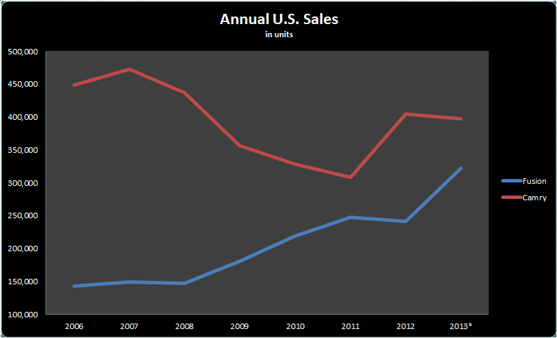 Ford's Fusion has a chance to do two things that haven't been done in some time. Right now the flashy sedan is on pace to break 300,000 annual sales in the U.S., something only the F-Series has done for Ford in nine years. It also represents the best chance for an American-made vehicle to take the No. 1 passenger car sales crown -- which has been held by Toyota's Camry for 15 of the past 16 years.