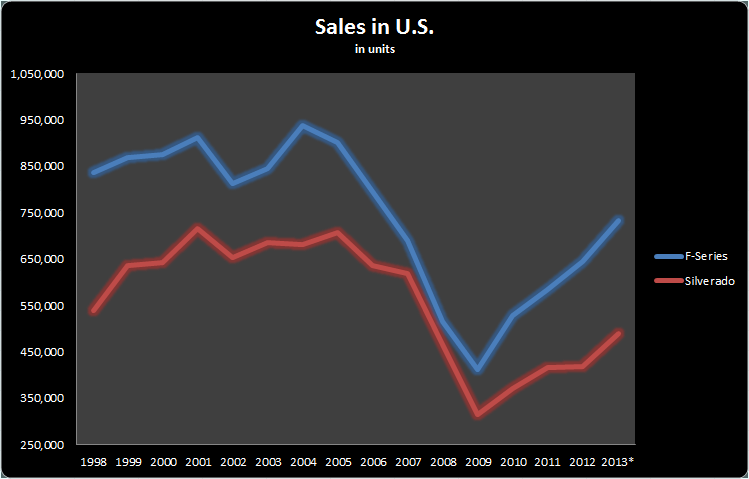 Ford's F-Series has even widened the sales gap since the recession, because some consumers refuse to buy from GM after its taxpayer-fueled bailout. GM loyalists often point out that if you combine all of GM's full-size sales, between the Silverado and Sierra, they do outsell Ford -- but that hasn't been true recently.