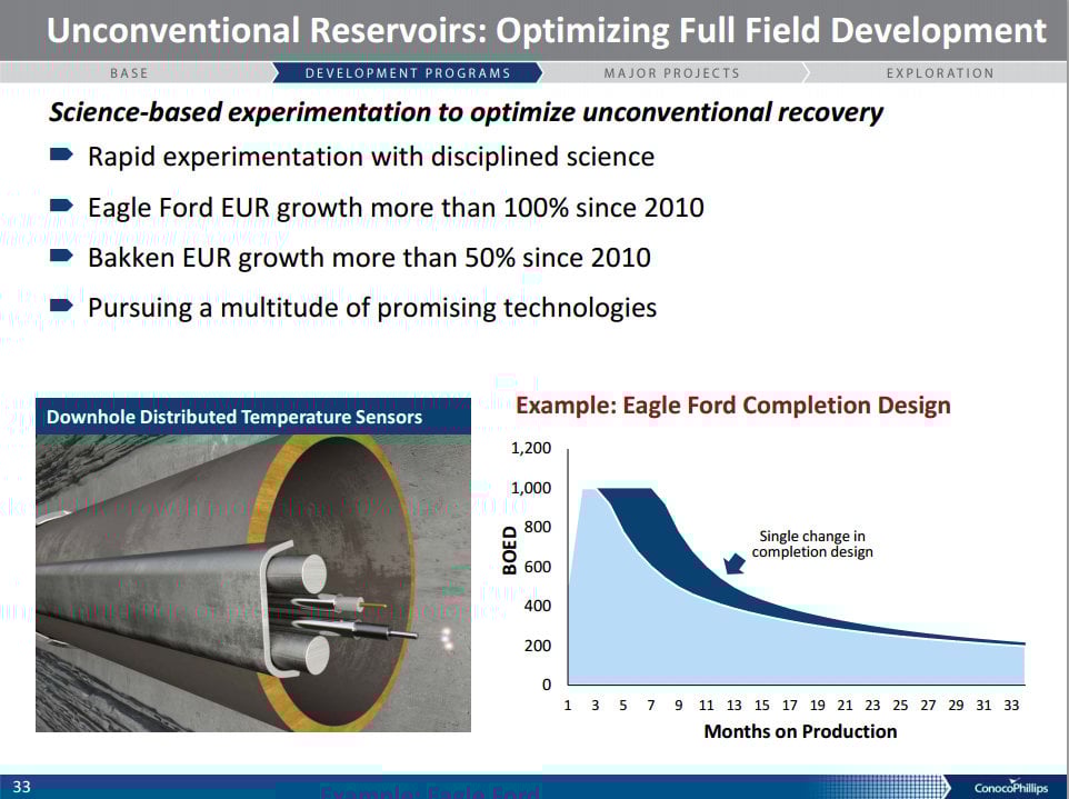 One company finding success of late is ConocoPhillips (COP 0.40%). Over the past few years the company has been able to double the EUR of its Eagle Ford shale wells, while seeing a 50% boost at its Bakken wells. Those are significant improvements to say the least. Not only does it mean more American made oil will be produced, but Conoco's investors will enjoy the higher returns that these wells produce. The slide below details some of what Conoco is doing on its quest to optimize its oil recovery efforts.