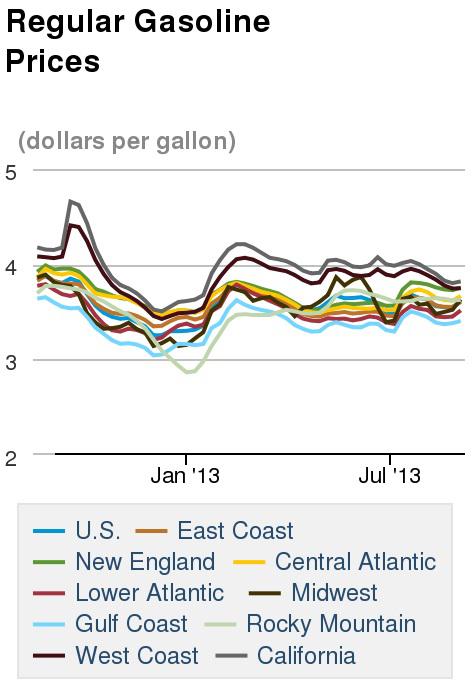 At these latest prices, New England pays the prettiest penny for gasoline ($3.756) while the West Coast takes the costly cake for diesel ($4.128). On the other end, the Gulf Coast can guzzle gas for just $3.406 and diesel for $3.897 per gallon.