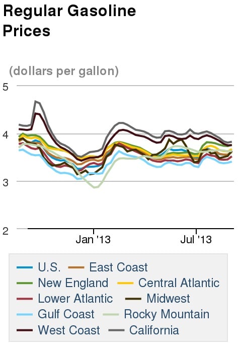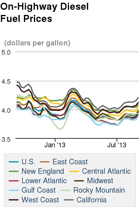 At these latest prices, New England pays the prettiest penny for gasoline ($3.756) while the West Coast takes the costly cake for diesel ($4.128). On the other end, the Gulf Coast can guzzle gas for just $3.406 and diesel for $3.897 per gallon.