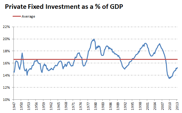 Take fixed private investment -- spending by businesses and households on fixed assets like factories and homes. As a share of GDP, it's still well below its historical average: