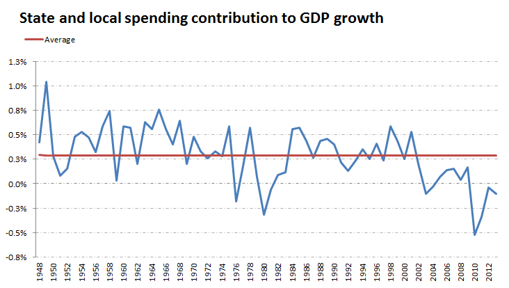 Or take state and local government spending. It usually contributes about a third of a percentage point to annual GDP growth. But because of austerity, it's subtracted an average of a third of point from GDP over the last three years: