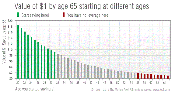 Think about that. From the time you are in your 20s and 30s until your 60s, your weekly wages might double. But money saved in your 20s and 30s could very realistically grow tenfold by the time you reach your 60s.