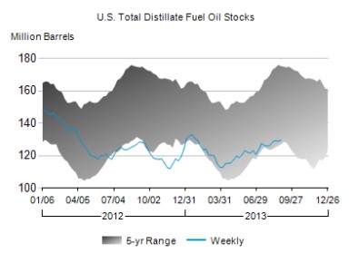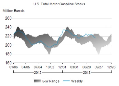 Distillates supplies, which include diesel and heating oil, increased 0.5 million barrels (0.5%) after dipping 0.3% the week before. Distillates demand remains strong, up a seasonally adjusted 6.9% for the last four weeks, and supplies remain near the lower limit of the average range for this time of year, according to the EIA.