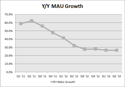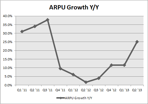 You can see from the chart that soon after Facebook introduced its mobile monetization strategy, the ARPU growth started to accelerate, and grew an explosive 25% in second quarter of 2013.