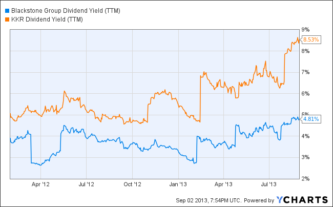 KKR and Blackstone manage their operations and cash well -- two signs of well-run businesses. But, they also offer phenomenal value through their dividend payments. As seen below, Blackstone and KKR's dividend yields exceed the mean dividend yield of the S&P 500 stocks by 110% and 340%, respectively. (S&P 500 data is from investment analytics firm FactSet.)