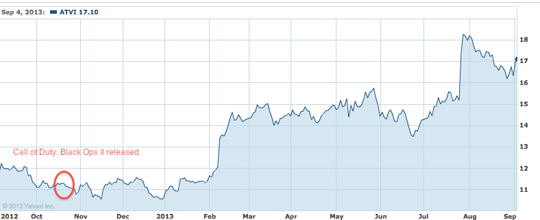 Activision is likely to duplicate the success that the company has seen with the previous installment of the series, Call of Duty: Black Ops II. The game grossed over $500 million in sales in the first 24 hours. Since the game was released in November 2012, shares of Activision have risen 35%.