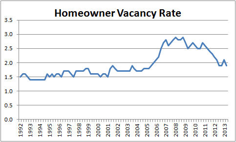 This is a pretty good indication that the housing recovery has legs, because it implies that there isn't an oversupply of properties on the market. The figures are nowhere near the kind of vacancy rates reached from 2006 through 2011.