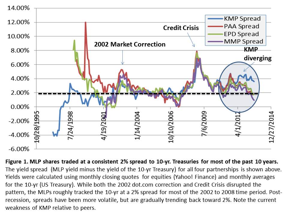 These Steady-Eddies include names like Kinder Morgan Energy Partners (NYSE: KMP), Plains All American Pipeline (NYSE: PAA), Enterprise Products Partners (NYSE: EPD) and Magellan Midstream Partners (NYSE: MMP). Over the years, they've performed admirably, but they haven't been immune to contractions. In fact, the group as a whole tracked the 10-yr Treasury notes at a 2% spread for much of their history; both up and down. Part of their remarkable success is attributable to the fact that they haven't had to cope with an upward rate trajectory for any sustained period of time. With rates at historic lows, that will likely change for the worse.