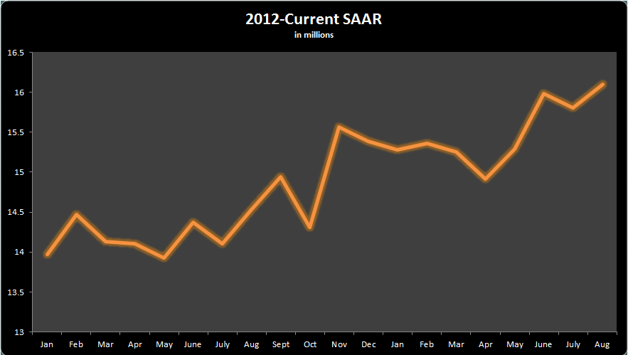I think VanAmburg is absolutely correct in the long-term outlook, but that shouldn't scare current Ford and GM investors. Let's keep in perspective that working through pent-up demand will likely still take a few years, at least. Right now, the U.S. market just broke through a seasonally adjusted annual rate of 16 million vehicles for the month of August; that's the first month to top that mark since November 2007. Here's a look at the SAAR since 2012.