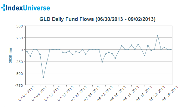 SPDR Gold Shares (GLD +0.56%), the world's largest gold-backed ETF, allows investors to leap into the gold market without the vagaries of the gold futures market. The ETF has seen $1.9 billion in outflows so far in the third quarter. This compares to outflows of $11.5 billion in the second quarter ended June 30, according to data compiled by IndexUniverse. The Feds decision on tapering could determine whether the outflows from gold-backed ETFs will continue or reverse.