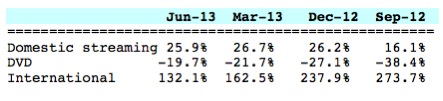 The other trend keeping Netflix investors on board are the net losses in cable/satellite subscribers in Q2 2013. Time Warner Cable (NYSE: TWC) had 573,000 fewer video subscribers in Q2 2013 (11.9 million) compared 12.5 million in 2012. Video revenue was also down.