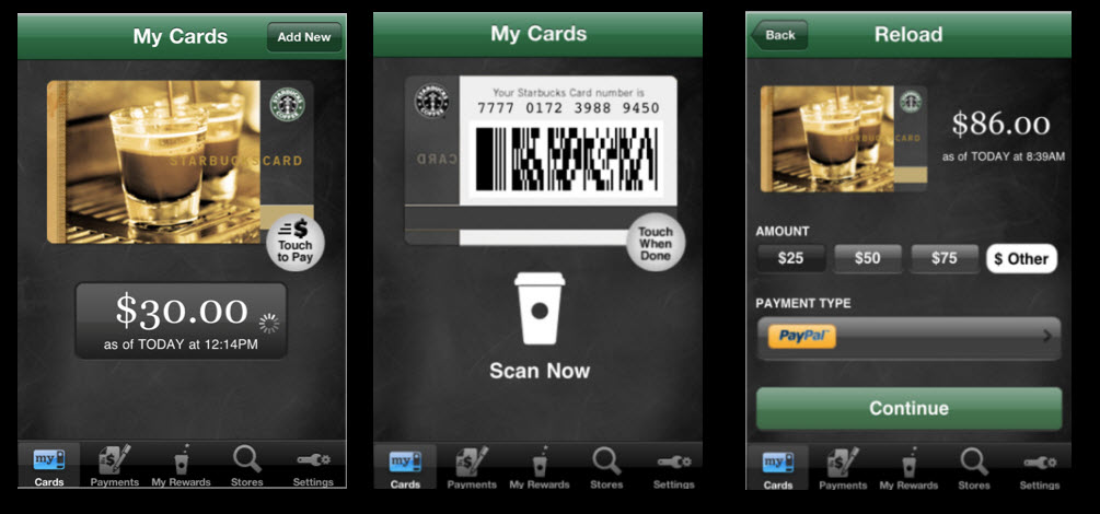 Starbucks is the leader and the first restaurant to introduce mobile-based transactions. Through the use of apps on handheld devices, customers are able to load money on a "virtual gift card" and present their phone at any location. A simple barcode is scanned from the handheld device and payment is automatically deducted from the virtual card to complete a transaction quickly and efficiently. Dollars can be loaded onto the virtual card though any major credit card or PayPal.