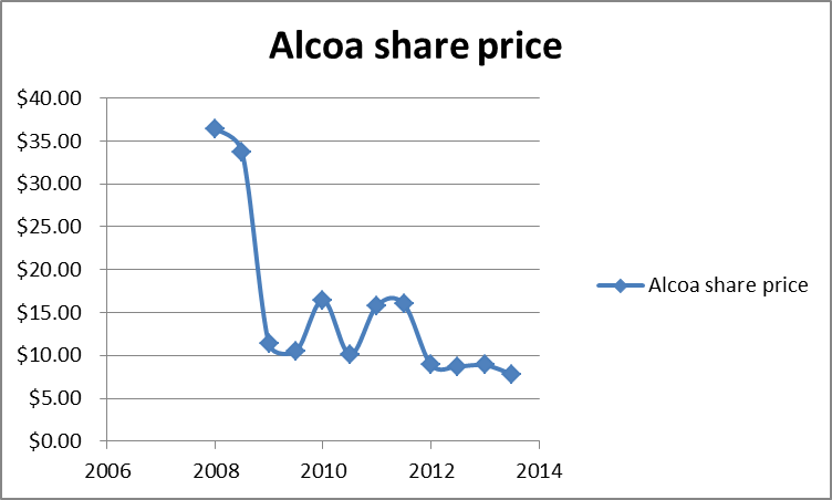The profitability of aluminum producers is almost entirely dependent on the spot price of aluminum. Consider the above chart of the price of aluminum since 2008, and compare it with Alcoa's share price over the same time period (below).