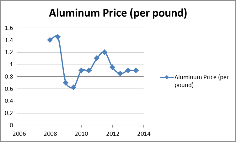 While it's not a perfect correlation by any means, there is a definite link between the spot price of aluminum and Alcoa's share price. There are other factors that cause shares to rise and fall, such as labor costs and production costs, which have been disproportionately high, especially after the price of aluminum started to fall several years ago.