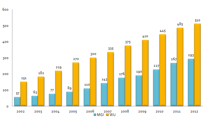 If you can accept that Xoom does not present a serious threat to Western Union's consumer-to-consumer segment, then the only other question to answer is if the company will continue to fend off competition from its primary rival, MoneyGram.
