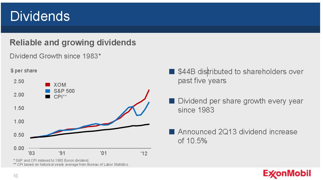 Over the past five years, oil and gas giant ExxonMobil (XOM +0.05%) has paid its shareholders $44 billion in dividends. Going back even further, Exxon has grown its payout to investors every single year since 1983. Rock solid dividends like that don't come along very often, which is why investors need to hold on to a good thing.