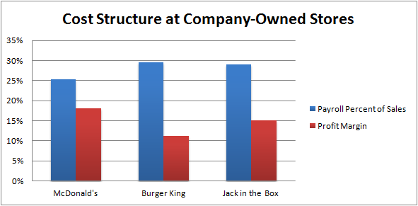 Even using this inflated measure of profitability, it is clear that each percentage point increase in payroll expenses would have an enormous impact on overall profitability. For instance, an increase of just one percentage point of Burger King's payroll as a percentage of sales would cause its bottom line to shrink by close to 9% (11.27% profit margin falls to 10.27%, an 8.8% decrease).