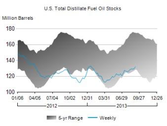 Distillates supplies, which include diesel and heating oil, increased 2.6 million barrels (2%) for a second straight week of inventory growth. Unlike gasoline, distillates demand for the last four weeks is up a seasonally adjusted 8.6% over the year-ago period, and supplies remain "near the lower limit of the average range," according to the EIA.