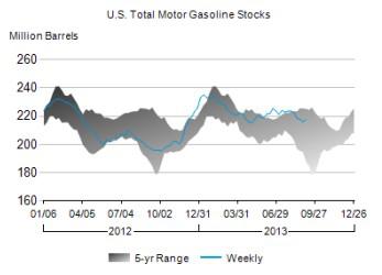 Gasoline inventories reversed the previous week's 1.8 million-barrel drop with a 1.7 million-barrel (0.7%) increase, putting the supply at 217.6 million barrels, 10.1% more than year-ago levels. Comparing the past four weeks to the same period in 2012, demand for motor gasoline is virtually unchanged. However, the average retail gasoline price for the most recent week still clocked in $0.26 per gallon below the 2012 pump price.