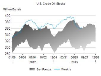 After dropping off 1.8 million barrels the previous week, crude oil inventories continue their steady downward draw. While refinery inputs remained similar to last week's numbers, imports fell by 238,000 barrels per day (bbpd). The crude supply of 360 million barrels is .0.3% above year-ago levels.