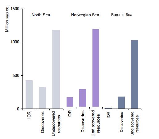 Norway has three substantial bodies of water to access offshore oil and gas developments. As the chart below indicates the North Sea, Norwegian Sea, and Barents Sea offer vast discovered and undiscovered resources. Norway recently raised its estimate for undiscovered oil and gas by 31% to 8 billion barrels of oil equivalent in the Barents Sea while the Norwegian Petroleum Directorate says it has increased its estimates for undiscovered recoverable oil and gas resources offshore Norway by 16% to 18.74 billion barrels of oil equivalent. This estimate is up from its last estimate made in 2011 of 16.17 billion boe and does not include some reserves in the Norwegian Barents Sea.