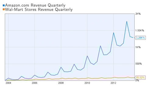 Last quarter, Wal-Mart had nearly $117 billion in earnings and Amazon had $15.7 billion. There really doesn't seem to be any comparison between the two. But if you take into consideration the fact that Amazon's growth rate since 2004 has been nothing short of phenomenal, you'll understand why I believe Amazon will become the biggest retailer. Every quarter they've experienced an increase in revenue. Amazon's quarterly revenue is up 1,280% since 2004, while Wal-Mart is only up 85% since then.