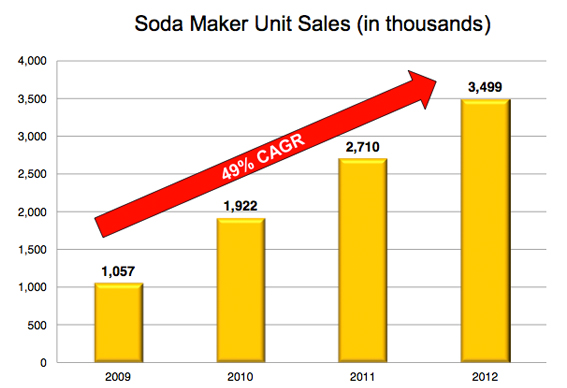 Since 2009, the company has experienced a 49% compound annual growth rate in its soda-maker unit sales. And according to official projections, if SodaStream manages to keep a 23% CAGR for the next three years, revenue should reach $1 billion by 2016.