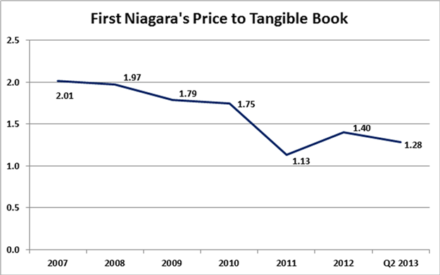 And while the price on the open market of First Niagara has seemingly plummeted, the tangible book value per share of has actually risen 30% since 2007. As a result of that, its price to tangible book value has declined dramatically: