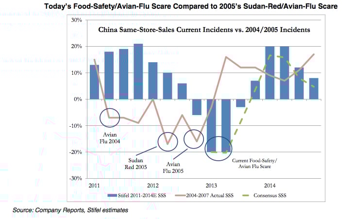 I believe the latest incidents (the chicken supply scandal in December 2012, and the avian flu scare in February 2013) will also pass and customers in China will resume their dining habits at the various Yum! Brands restaurants. Management is optimistic that a recovery will occur as early as the fourth quarter of 2013. Analysts at Stifel have shown how the company has recovered from prior incidents in the past.