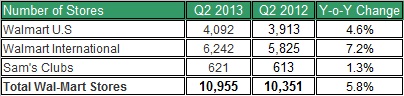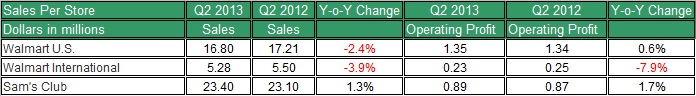 This means Wal-Mart hasn't done well in the past quarter, as its earnings report might suggest. The rise in revenues in Wal-Mart's U.S. and International segments was solely due to an increase in the number of stores. On average, stores have done worse in the second quarter compared to the same quarter in 2012.