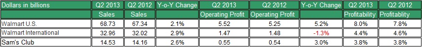 Wal-Mart U.S is the most profitable at 8%. Sam's Club is the least profitable at 3.8%. Net sales grew in all segments, with Wal-Mart international leading the way slightly with a 2.9% gain.