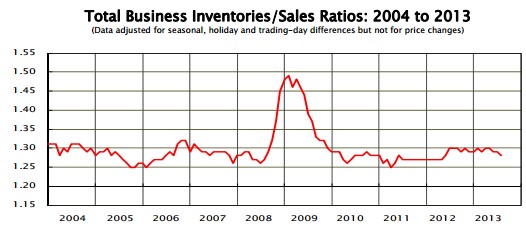To understand the rate at which goods are being made and sold, economists compute an inventories/sales ratio. Since sales increased even more than inventories from June to July, the inventories/sales ratio fell from 1.29 in June to 1.28 for July. The July 2012 ratio clocked in at a slightly higher 1.30 reading.