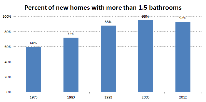 What's interesting is that even though we're living in larger homes, the size of an average household is shrinking. In 1975 the average American household had 2.94 persons. By 2004 that was down to 2.57. Oddly, as recently as 1986, just 12% of new homes had three or more bathrooms. Last year, nearly a third did. Indeed, the average new home now has more bathrooms than occupants. Look how far we've come, grandma!