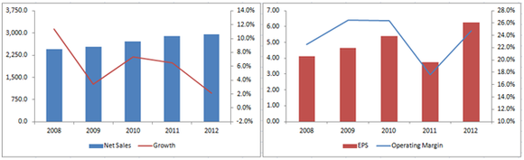 Though the company's top line growth was good enough in 2011, the operating margin and EPS fell drastically as the costs and expenses rose to 82.4% of sales from 73.6% in 2010. The major reason behind this increase was that other expenses had shot up by 8.5% of sales. This included charges related to legal settlements and commitments of $246.5 million, charges for the impairment of Greek bonds of $11.5 million, and net restructuring costs of $7.8 million. These were all one-time expenses as the company's operating margin reverted to its normal level in 2012. Net sales in 2012 and 2011 were seriously affected by the discontinuation of sales of a bulking continence product and a decline in sales of surgical continence products.