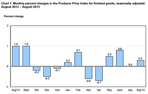 The Producer Price Index for finished goods -- which measures prices received by domestic producers of goods and services -- increased a seasonally adjusted 0.3% for August, according to a Labor Department report (link opens as PDF) released today.