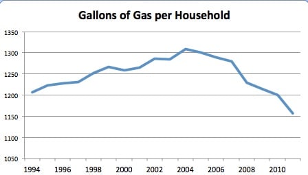 Though we showed a steady increase in gas usage between 1994 and 2004, we've been trending lower ever since. In fact, the average U.S. household now purchases 11.5% less gasoline than it did in 2004.