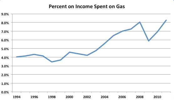 Where once we were spending 4% of our income on gasoline, we are now spending 8.3%. Though those numbers might sound small, they actually make a huge difference.