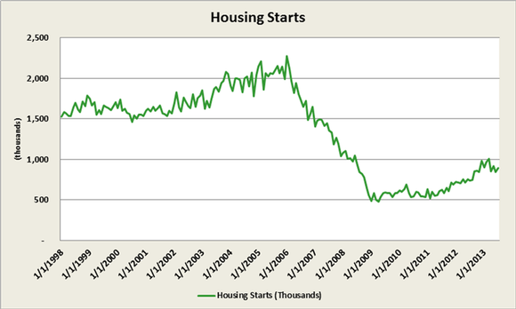 Housing starts represent new home construction. While we're still well below the levels we saw 15 years ago, housing starts in July 2013 were 87% above April 2009's low. That represents an annual growth rate of over 15.5%, even including the minor dip seen in the second quarter of this year.
