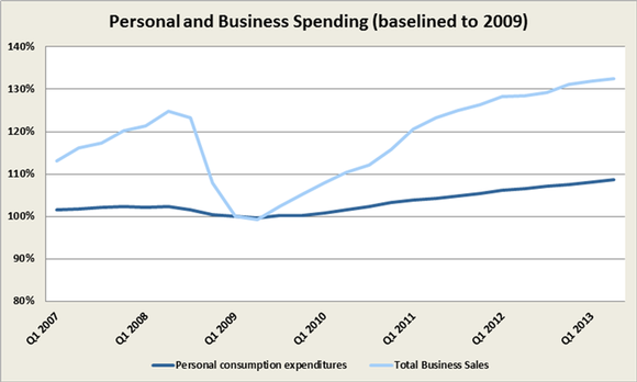 Lastly, Powell noted the improvements in both household (personal) and business spending as the final reasons for optimism in the economy. While their growth has slowed down since the immediate recovery from the recession, both personal consumption and business sales (trade sales and shipments) are now 6% above their Q2 2007 levels.