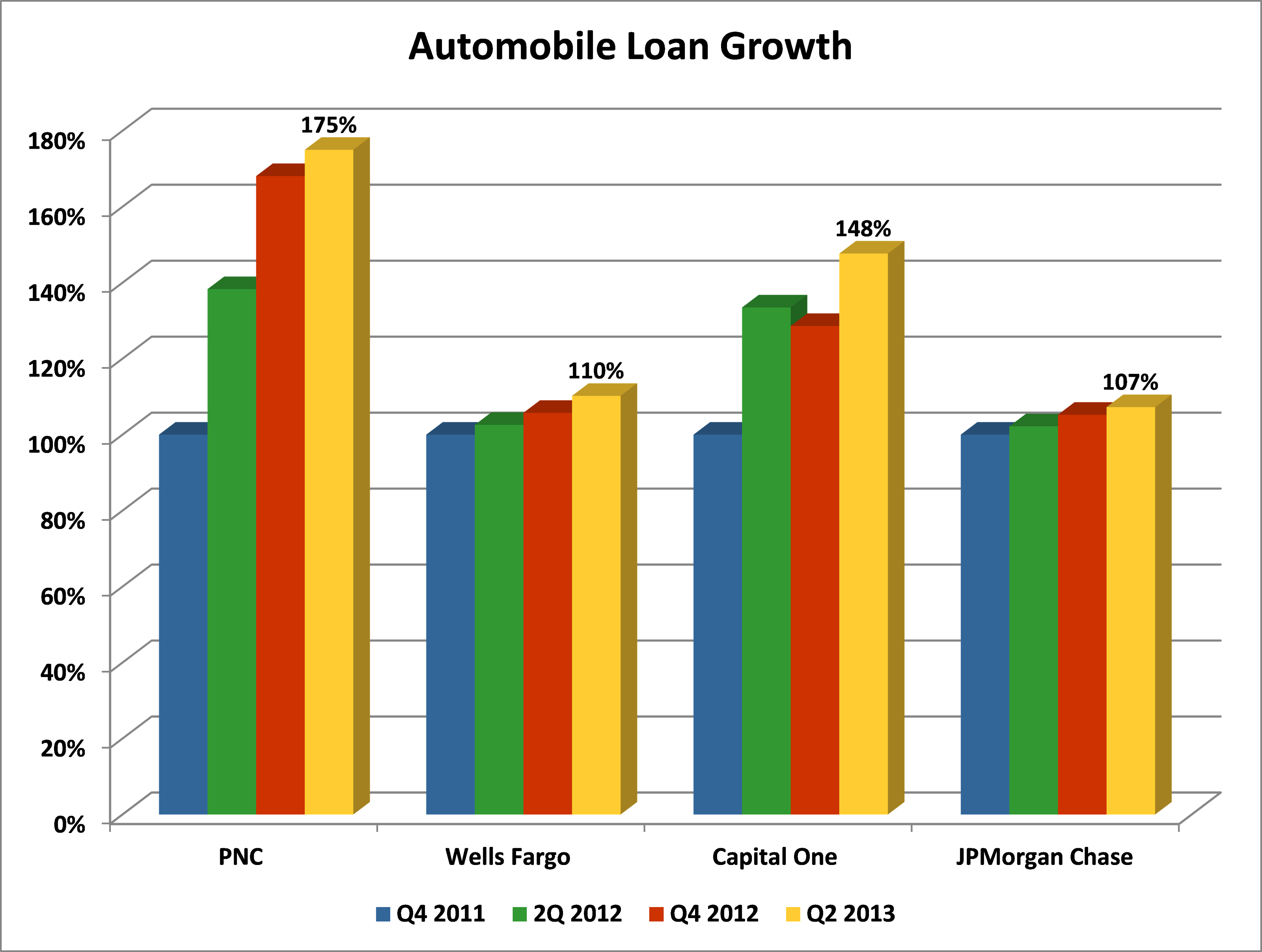 Yet even though Capital One and PNC have seen their automobile loans held skyrocket, that tells only half the story. Since those two banks have a smaller starting-point number, the growth looks huge. But Wells and JPMorgan have a much larger balance sheet, so overall origination volume may provide a better picture of which bank is being the most aggressive: