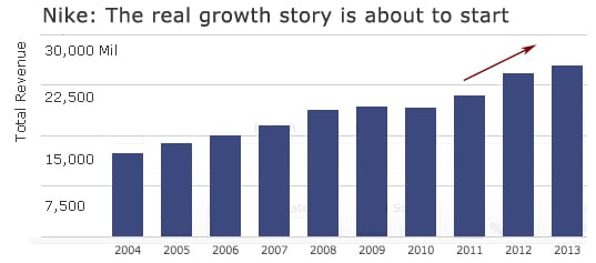 The industry certainly looks fierce. That should not be a problem for Nike, however, which has all the competitive advantages needed to keep its leading position in the global athletic footwear, apparel, and equipment market, which is worth as much as $284 billion. With more than a thousand factories all over the world and one of the strongest global brands ever created, Nike is well prepared to capitalize on its emerging markets business and welcome one billion new consumers on the way.