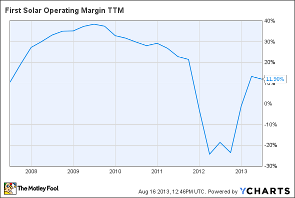 First Solar's efforts have worked. The company's operating margins have stabilized. Unlike its other competitors, First Solar is solidly in the black this year, and is predicted to make money in the future. Analysts expect First Solar to earn $3.80 a share in 2013 and $3.28 a share in 2014. While the company is expected to have declining profits for the next five years, First Solar current strength will give it opportunities to acquire future growth at basement prices. Going forward, First Solar also hopes to lower manufacturing cost per watt further to $0.40 by 2017 from $0.63 in 2013 .