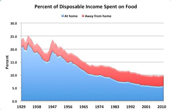 Obviously, we don't have records that far back to back up my statement. Fortunately, the USDA has been keeping tabs on how much we spend on food since 1929. Taken as a percentage of our disposable income, the amount has dropped dramatically in the last 85 years. In fact, relative to our incomes, food has simply never been cheaper.