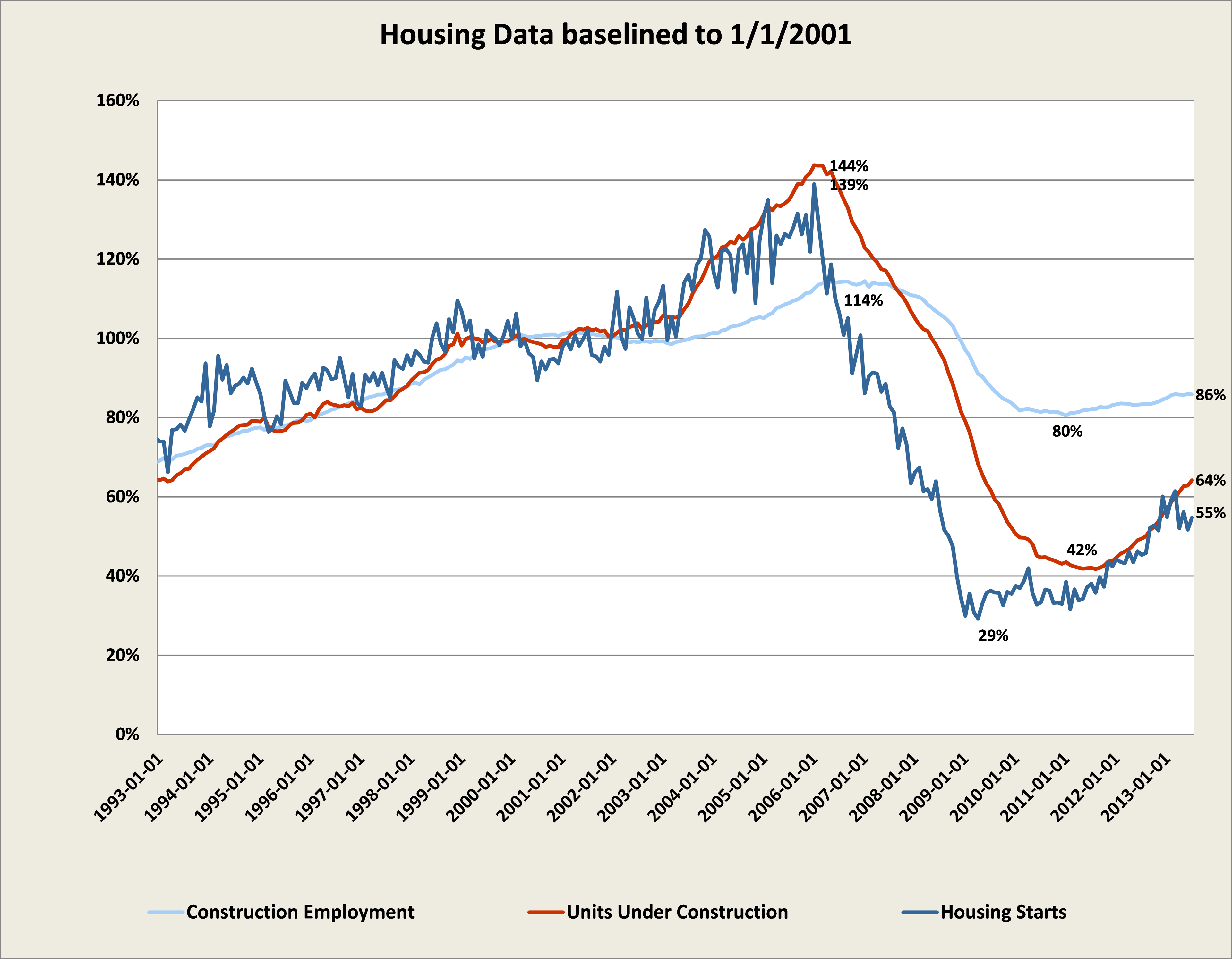 The first question becomes, is construction actually on the mend? When we check the data for three key areas -- housing starts, construction employment, and the total number of homes under construction -- we see: