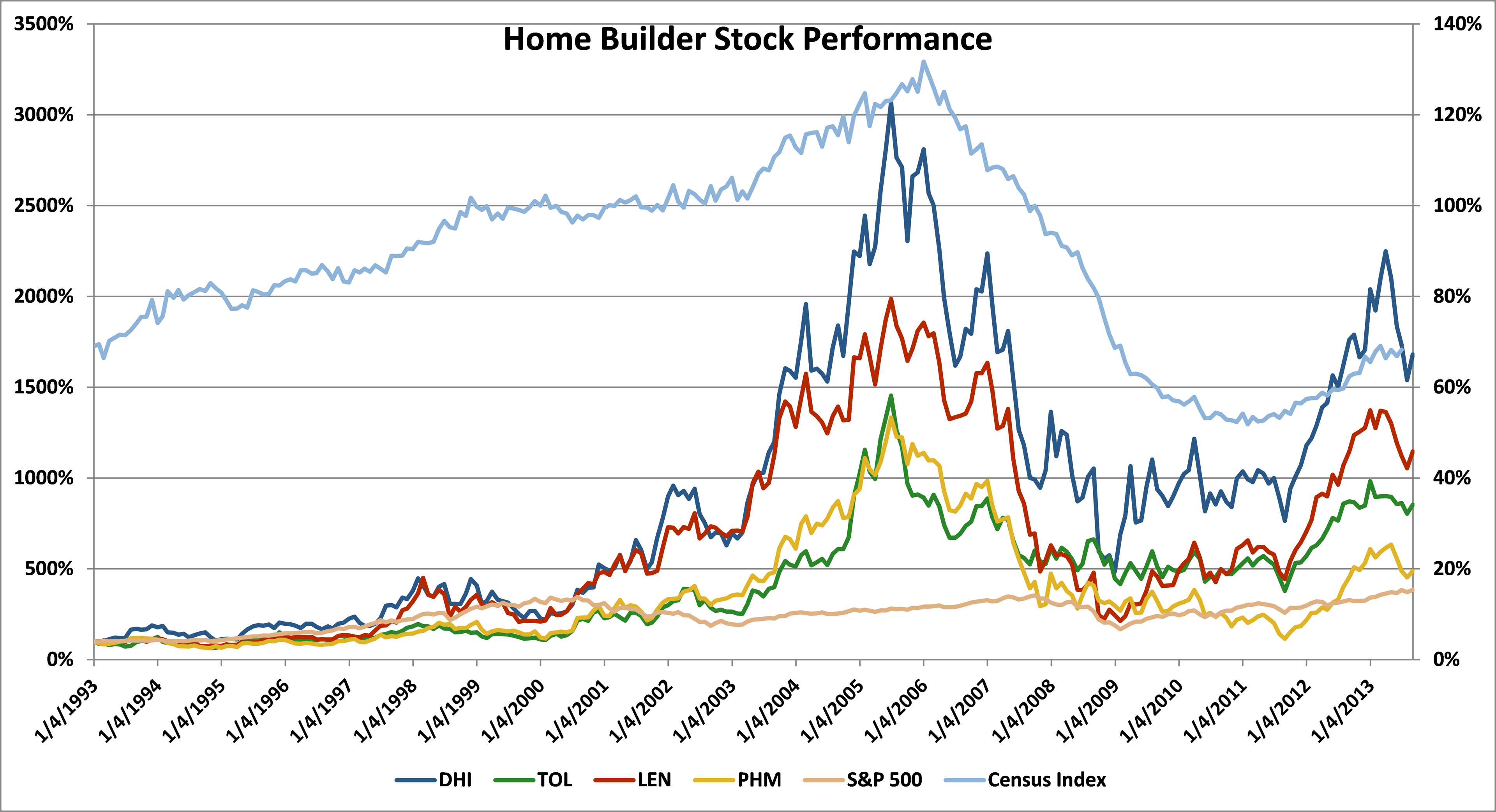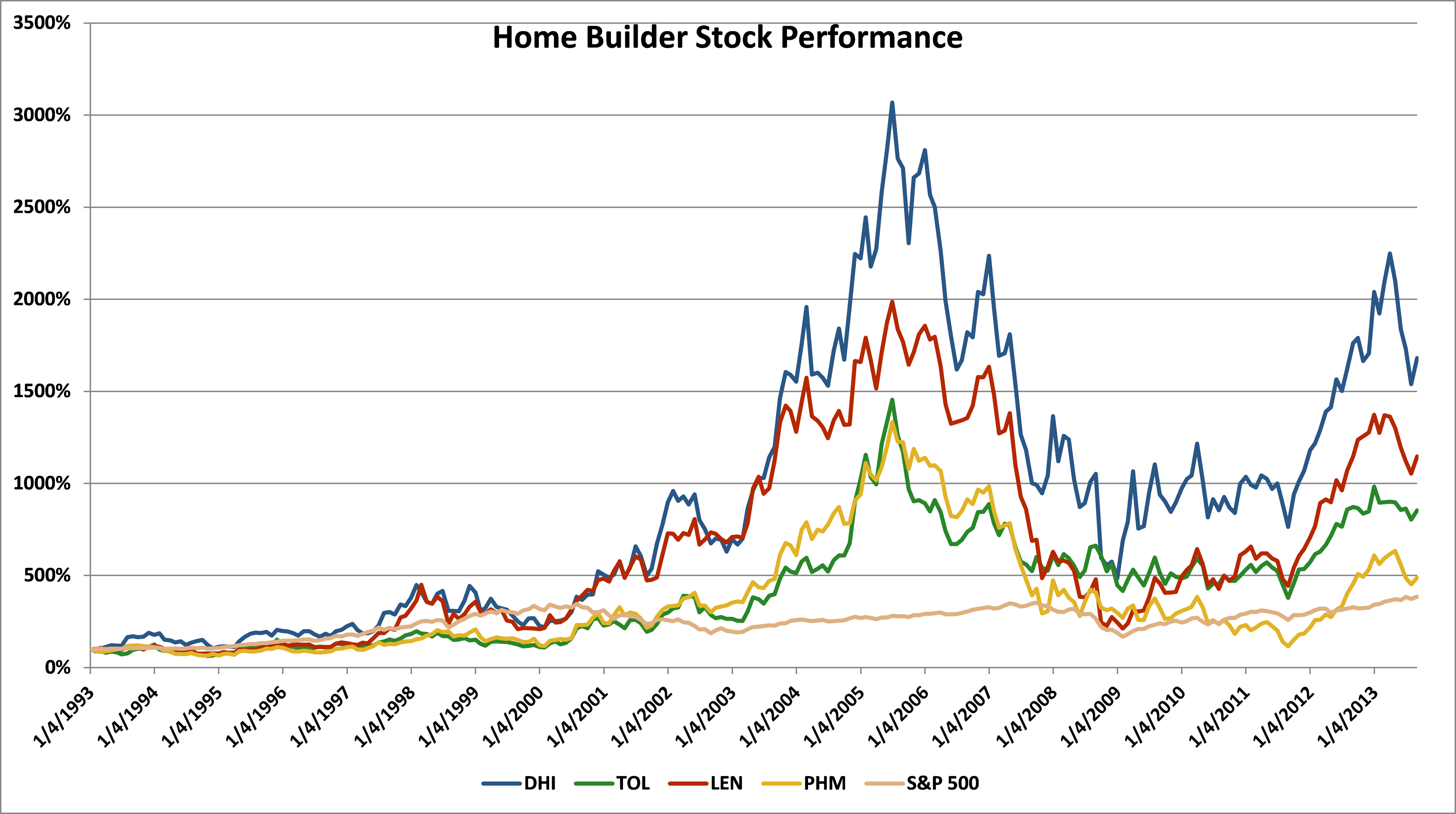 When we look at the stock performance of four of the largest public homebuilders over the last 20 years we see they have all performed well when compared to the S&P 500 even after accounting for their tremendous falls in from 2005 to 2010: